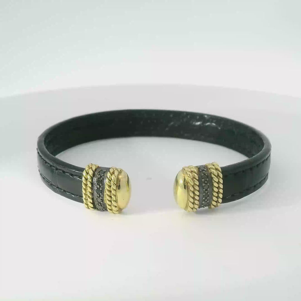 This stylish and fashionable bracelet by designer Cassis features black diamonds set in between 18 karat yellow gold hand twisted rope design. This bracelet is genuine American alligator.