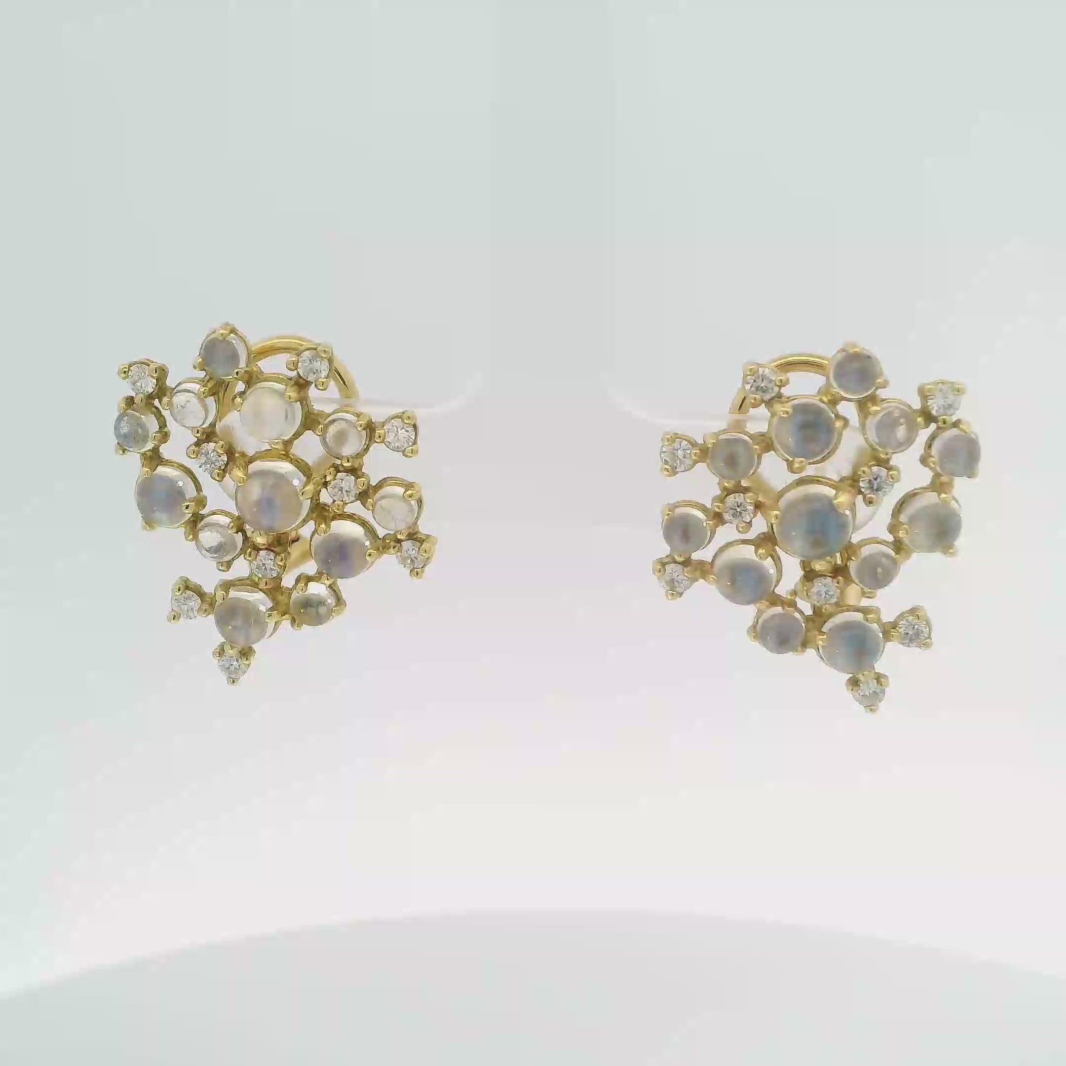 Indulge in luxury with our 18kt Moonstone Cluster Earrings. Crafted from 18kt Yellow Gold, these earrings feature a stunning 5.48ct of Moonstone and a sparkling .65ct of diamonds. Elevate any outfit with these exclusive, sophisticated earrings.