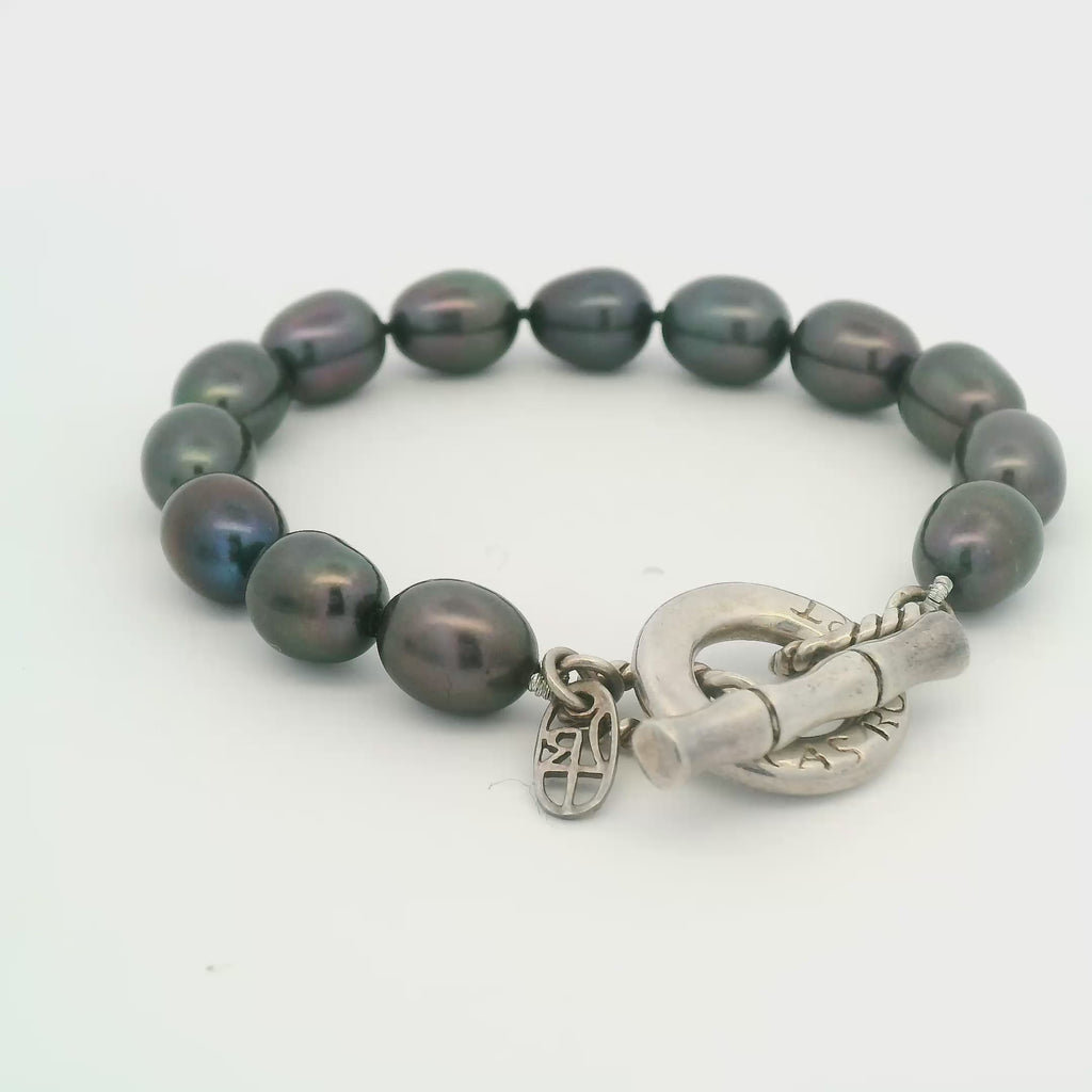 This elegant bracelet features 9 mm cultured freshwater pearls in a rich dark gray and silver tone, offering a refined, modern look. Finished with a sterling silver, finger-friendly toggle clasp accented by a bamboo-shaped bar, this piece blends natural beauty with thoughtful design for effortless, everyday elegance.