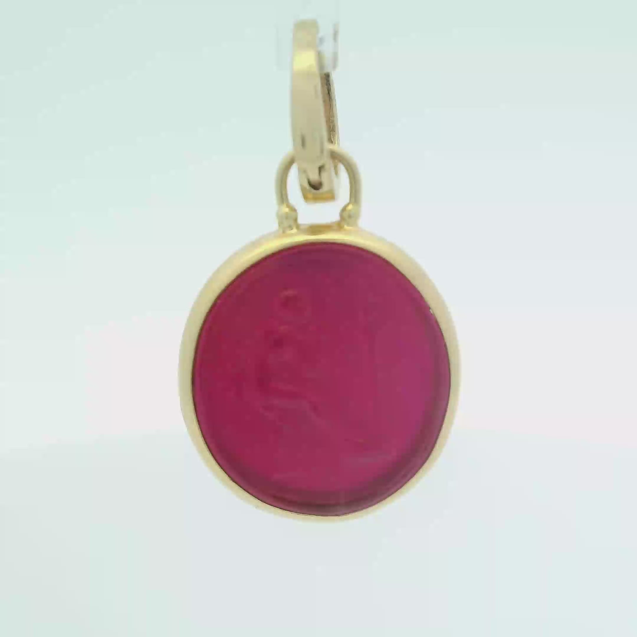 This stunning circular pendant features vibrant pink venetian glass backed by mother of pearl and encased in a luxurious 14kt gold setting. Its unique design captures the light beautifully, making it a perfect accessory for any occasion. Elevate your jewelry collection with this exquisite piece that combines elegance and charm.